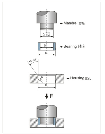 机械压装:通常情况下,轴承可以采用压力装配的方式进行安装,装配时应采用芯轴慢慢压入,禁止直接击打轴承以免产生变形,装配前应确保座孔内表面光洁无异物。