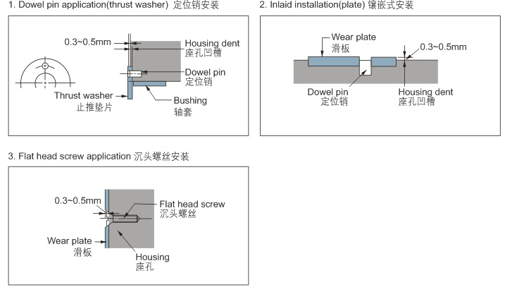 | 止推垫片和滑板应当安装在座孔的凹槽内,为了避免零件的移动建议使用定位销或沉头螺丝加以固定。 |